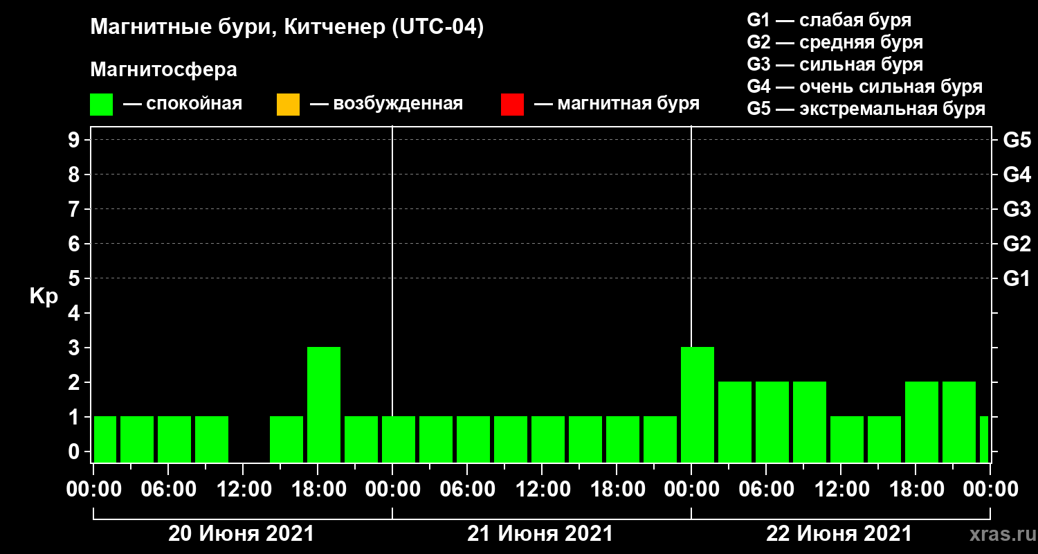 Изменения геомагнитного индекса Kp с 20 по 22 июня 2021 года для средних широт