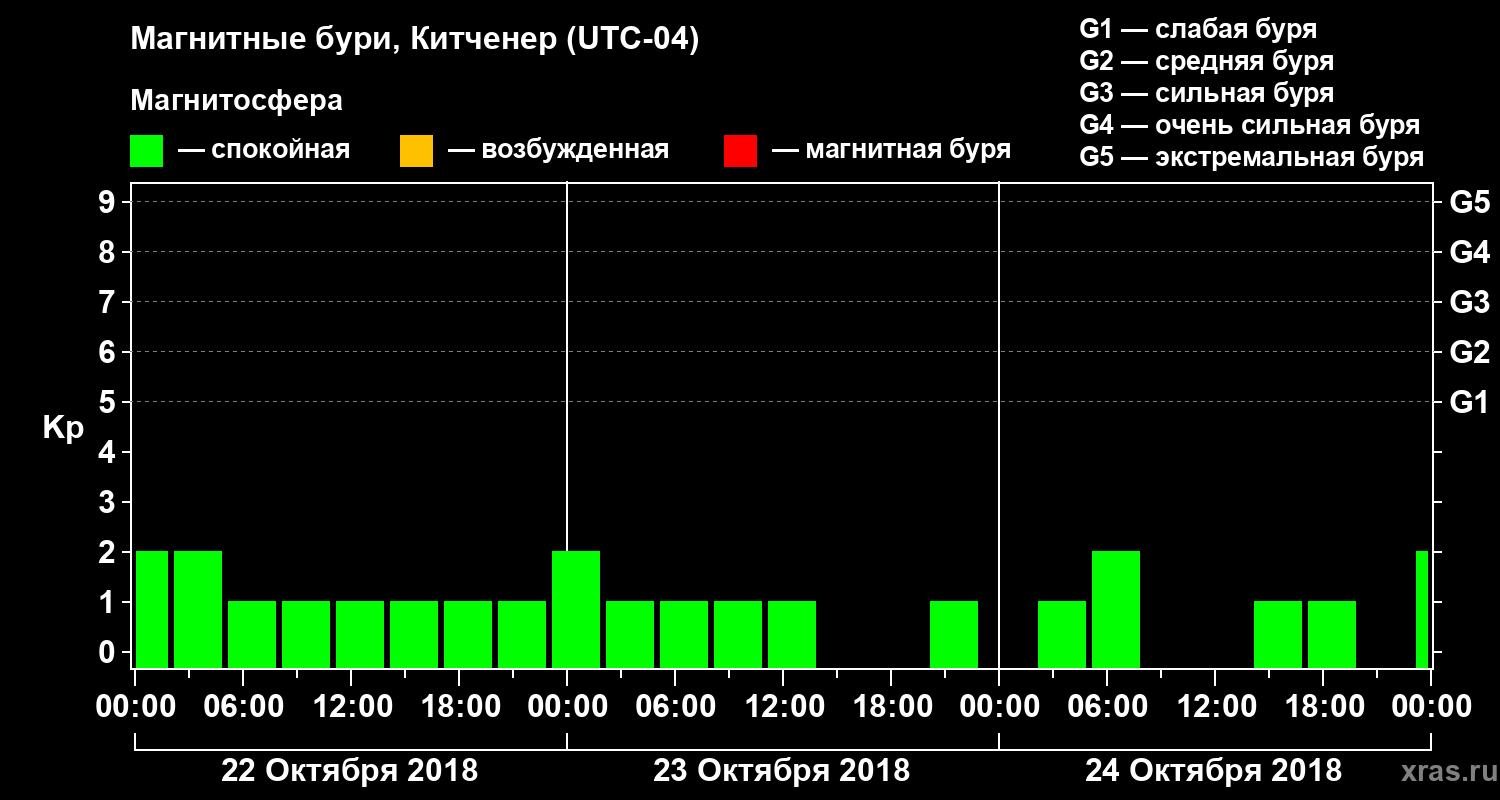 Изменения геомагнитного индекса Kp с 22 по 24 октября 2018 года для средних широт