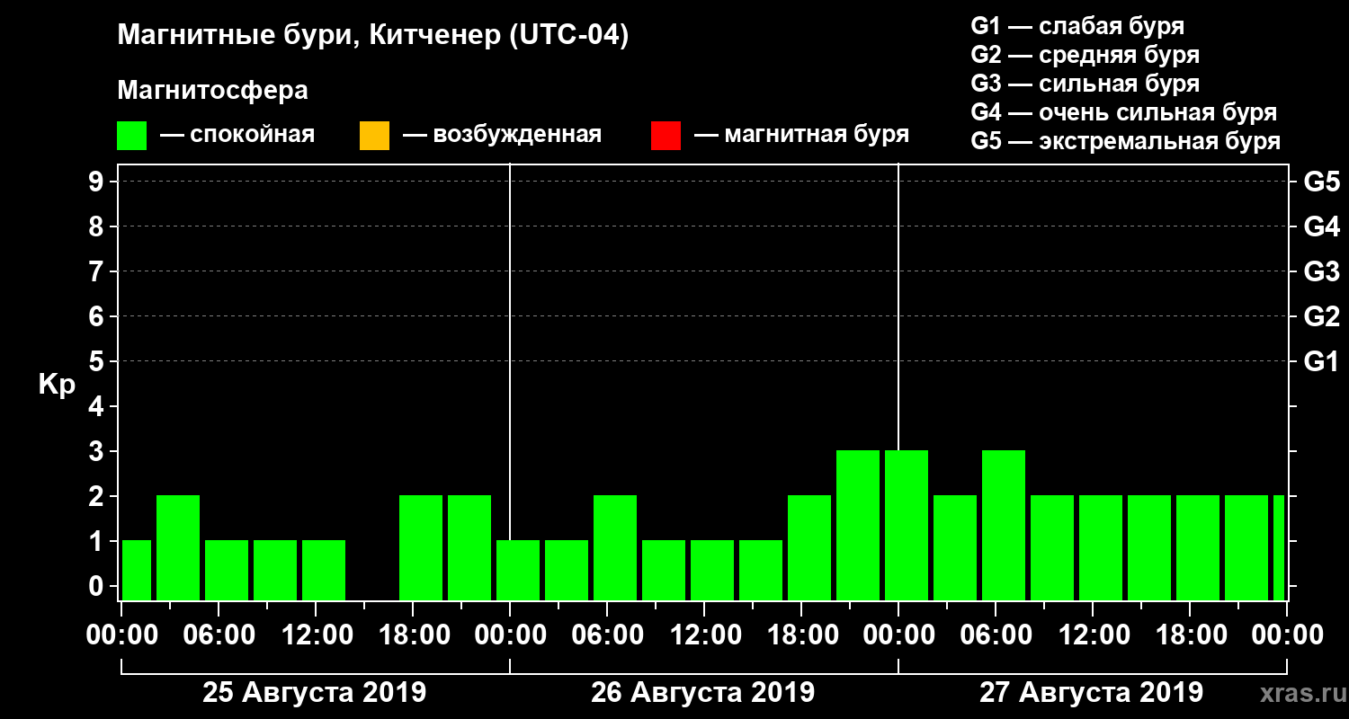 Изменения геомагнитного индекса Kp с 25 по 27 августа 2019 года для средних широт
