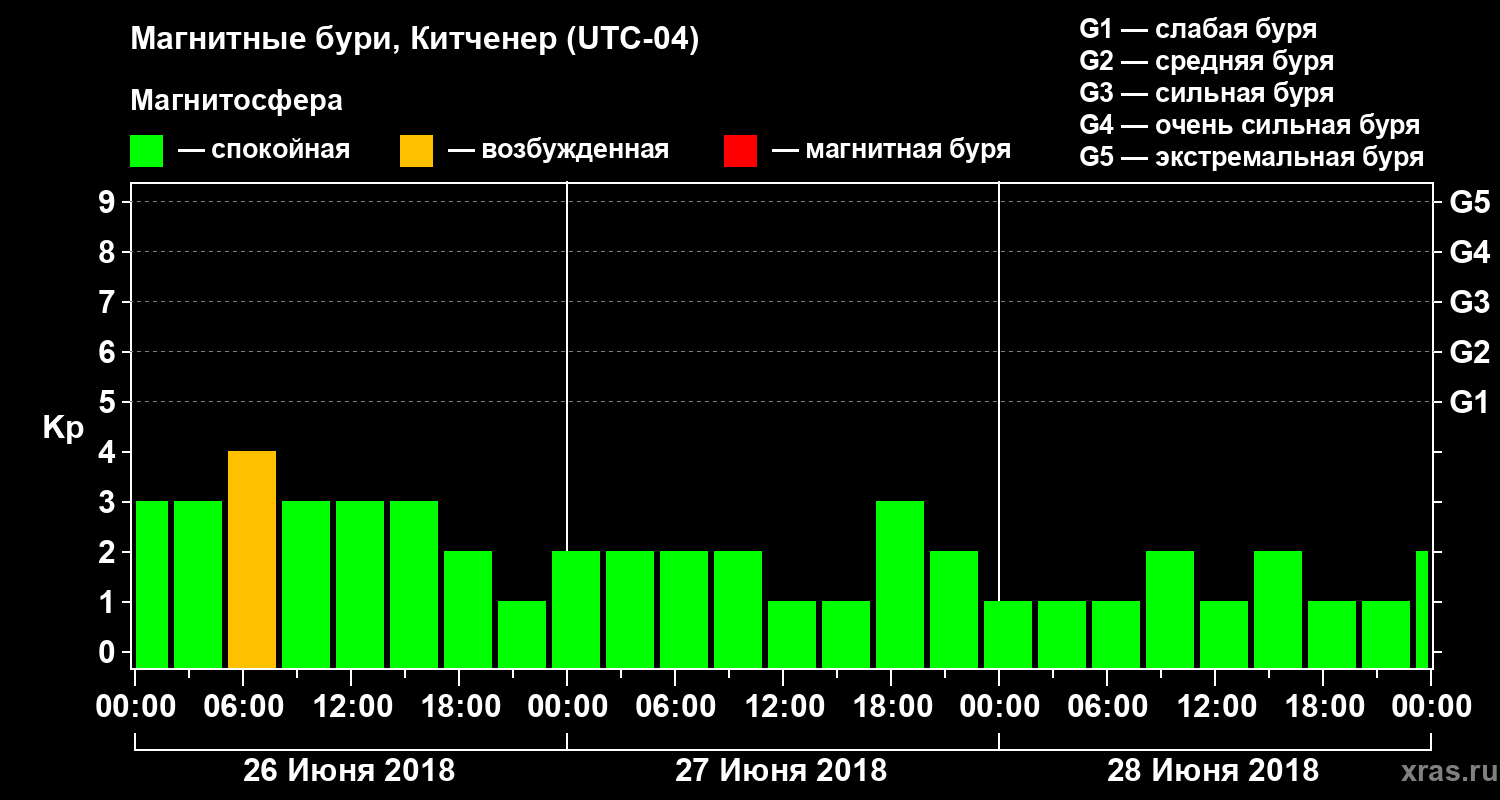Изменения геомагнитного индекса Kp с 26 по 28 июня 2018 года для средних широт