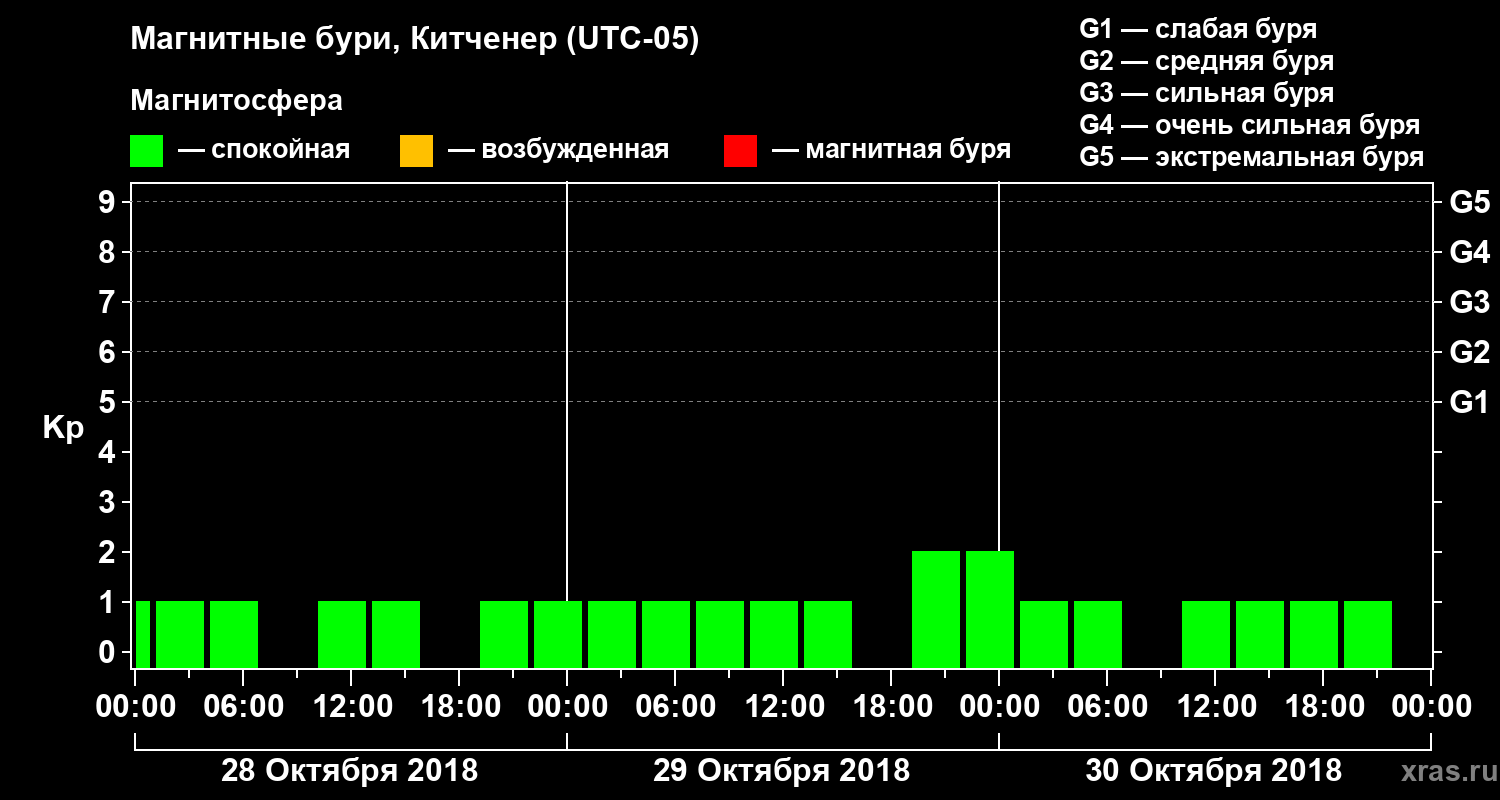 Изменения геомагнитного индекса Kp с 28 по 30 октября 2018 года для средних широт