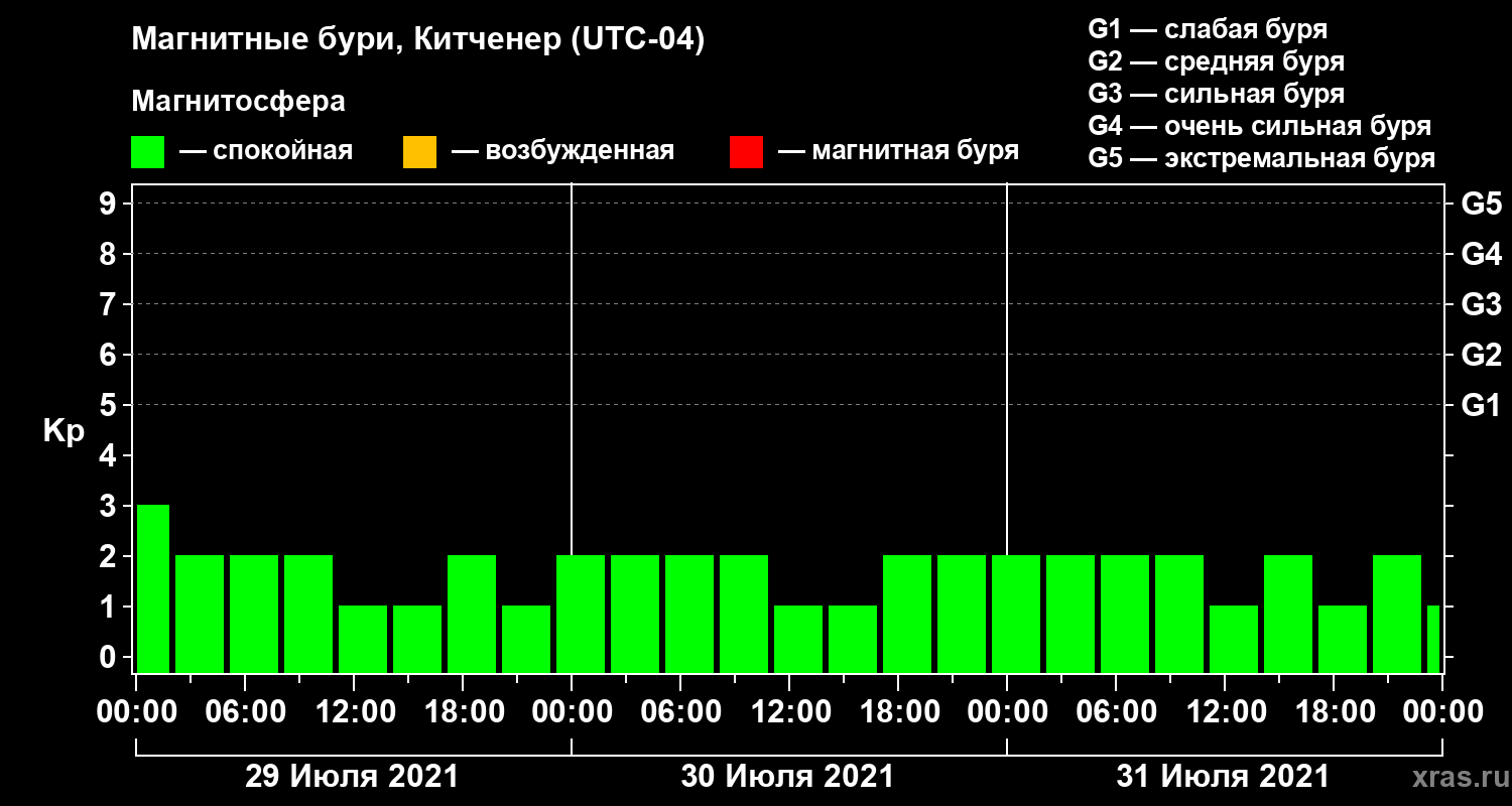 Изменения геомагнитного индекса Kp с 29 по 31 июля 2021 года для средних широт