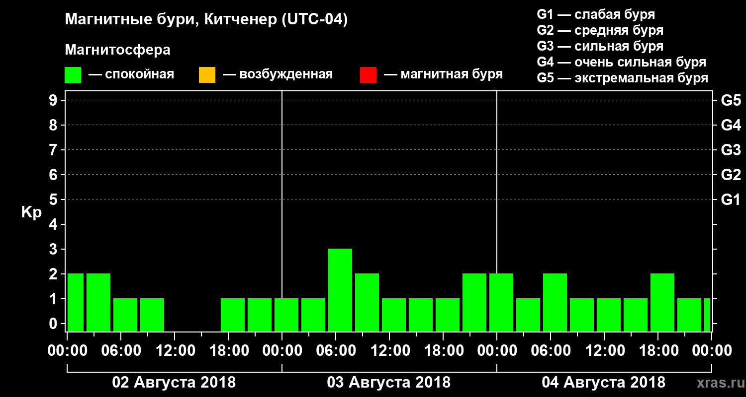 Изменения геомагнитного индекса Kp с 2 по 4 августа 2018 года для средних широт