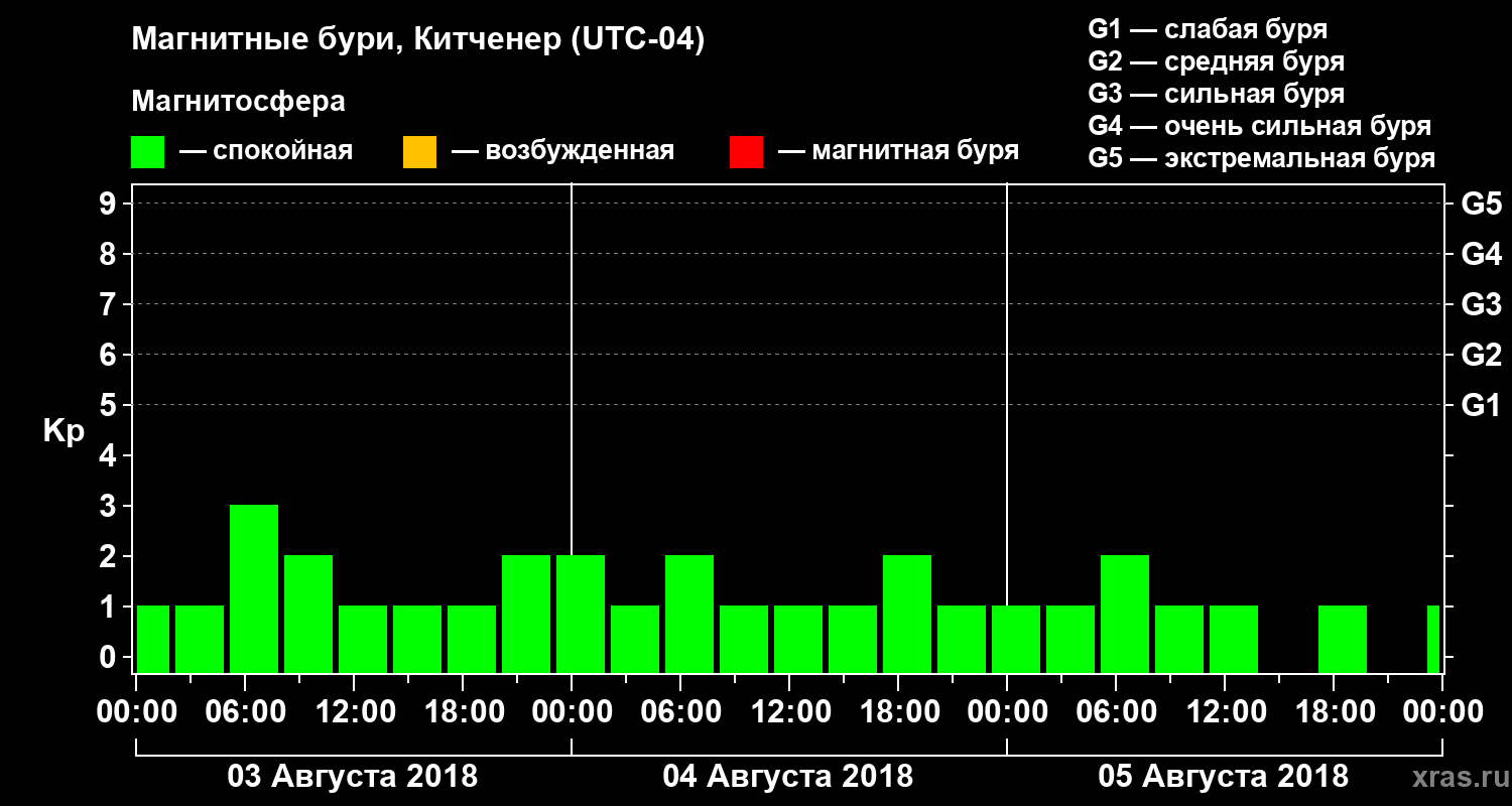 Изменения геомагнитного индекса Kp с 3 по 5 августа 2018 года для средних широт