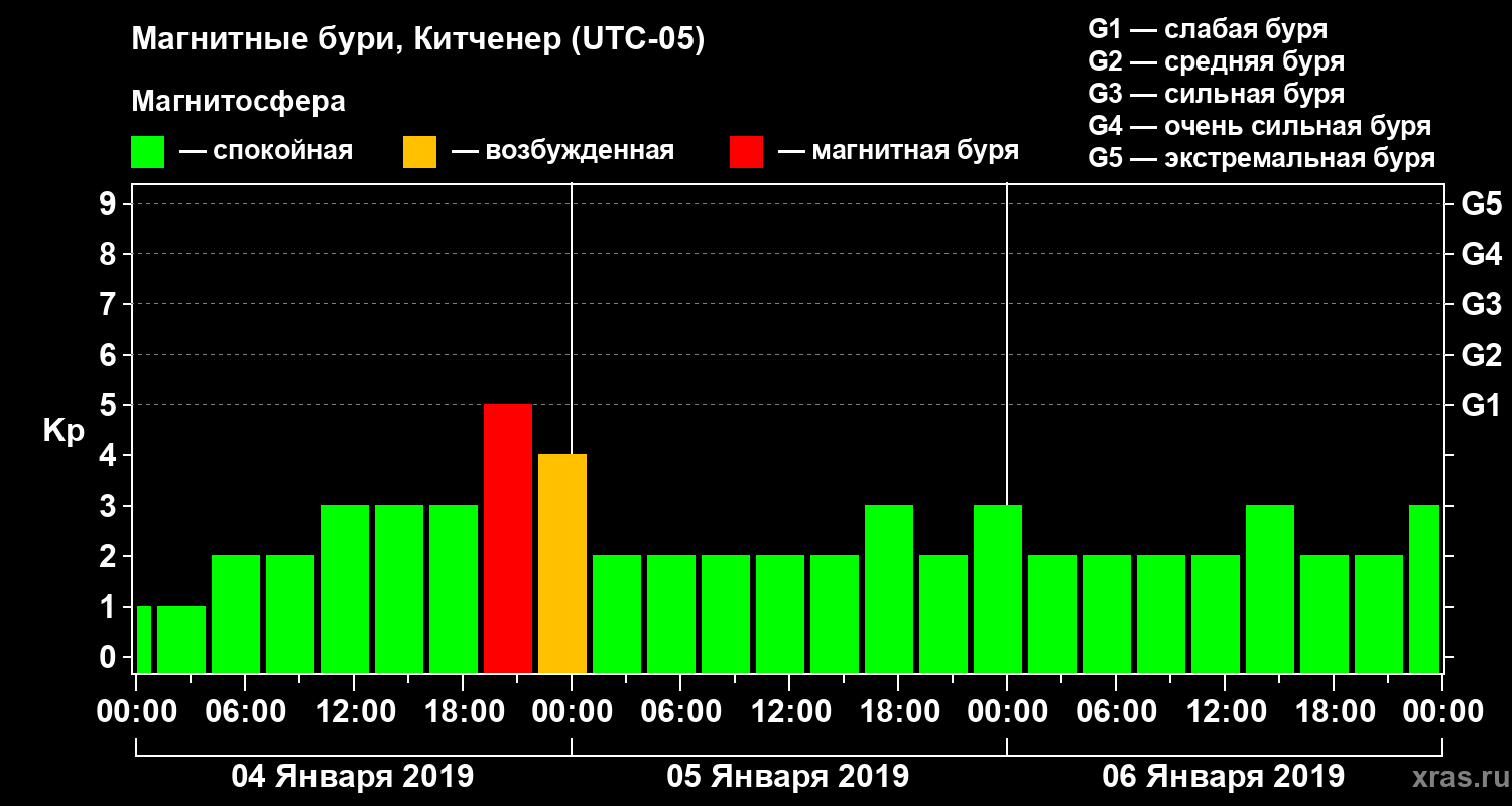 Изменения геомагнитного индекса Kp с 4 по 6 января 2019 года для средних широт