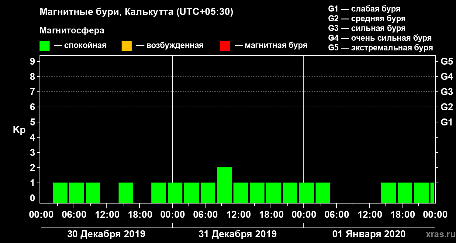 Изменения геомагнитного индекса Kp с 30 декабря 2019 года по 1 января 2020 года для средних широт