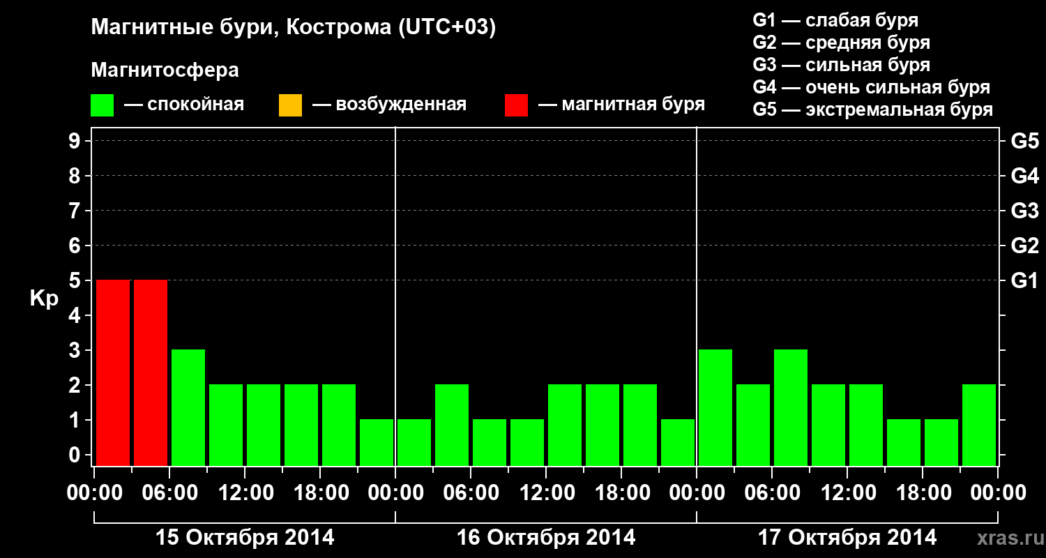 Изменения геомагнитного индекса Kp с 15 по 17 октября 2014 года для средних широт