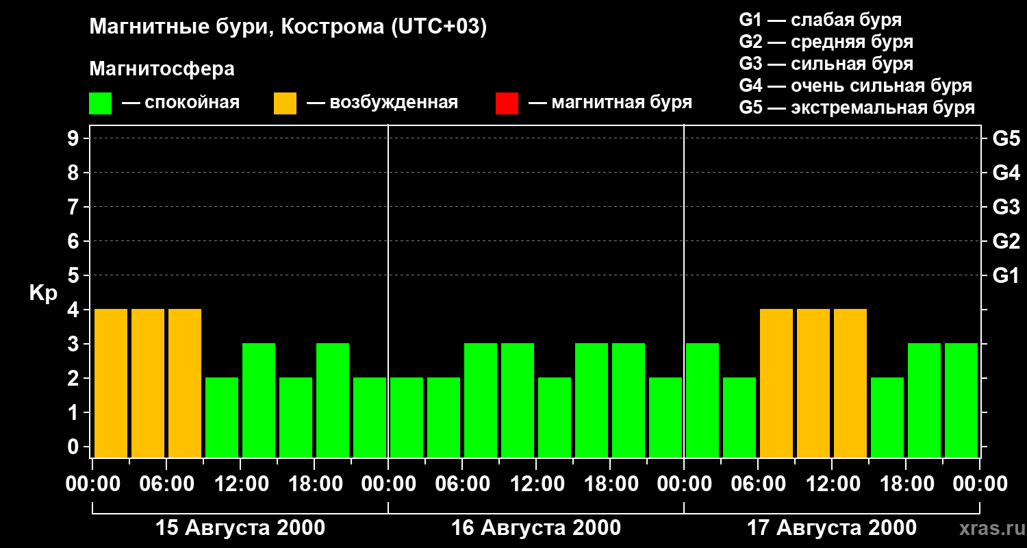 Изменения геомагнитного индекса Kp с 15 по 17 августа 2000 года для средних широт