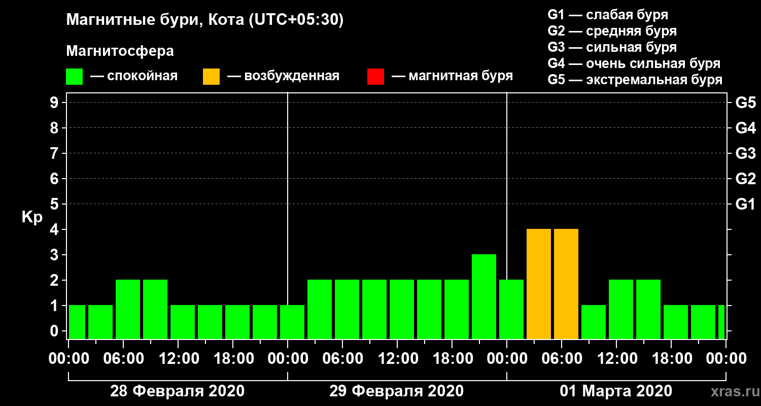 Изменения геомагнитного индекса Kp с 28 февраля по 1 марта 2020 года для средних широт