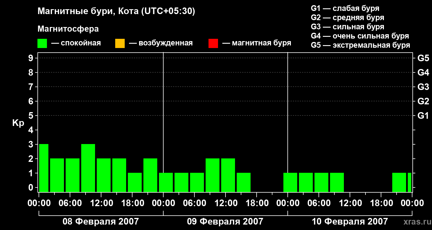 Изменения геомагнитного индекса Kp с 8 по 10 февраля 2007 года для средних широт