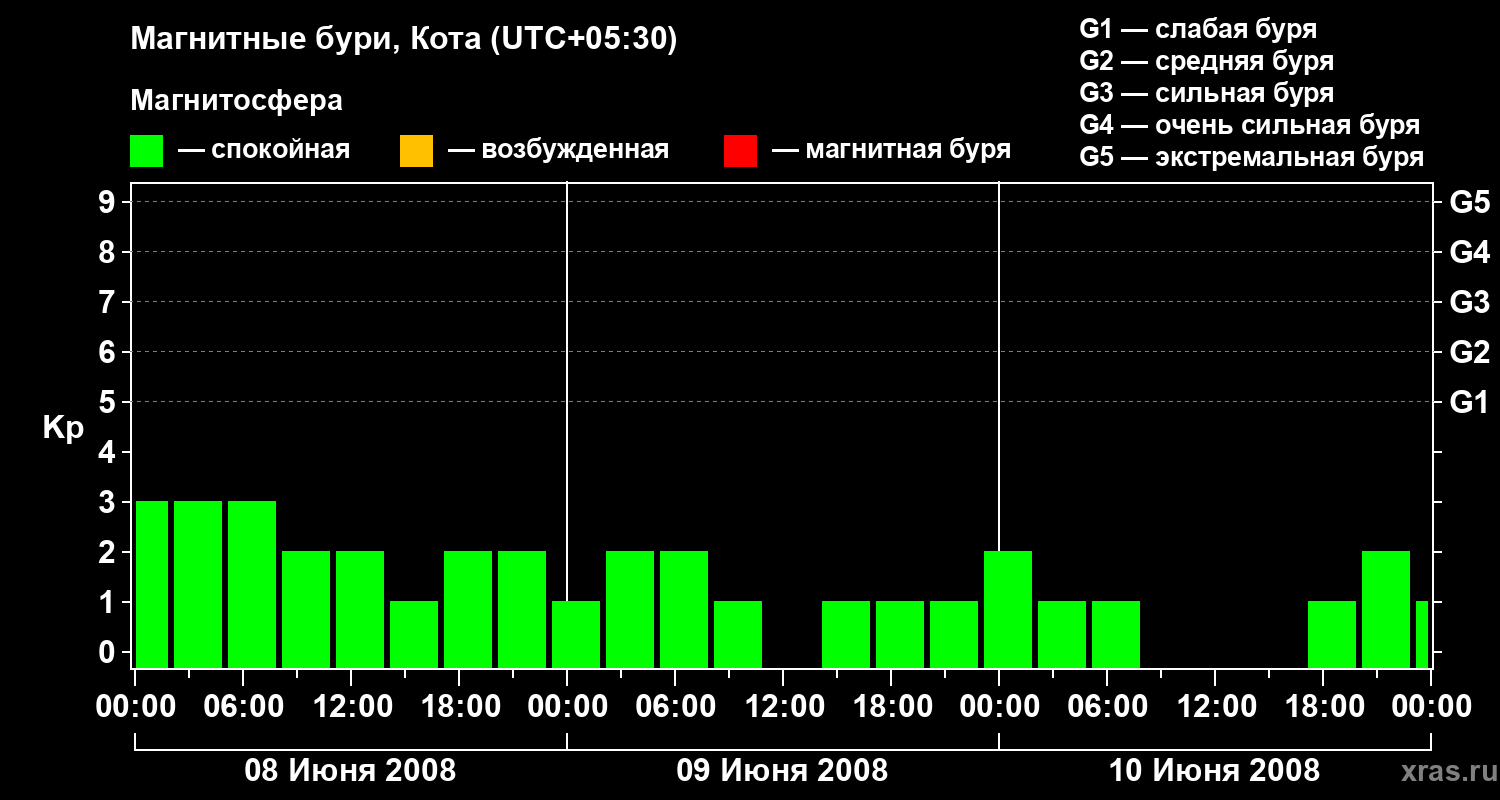 Изменения геомагнитного индекса Kp с 8 по 10 июня 2008 года для средних широт
