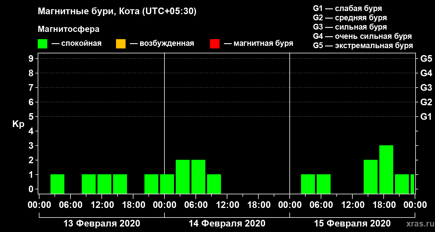 Изменения геомагнитного индекса Kp с 13 по 15 февраля 2020 года для средних широт