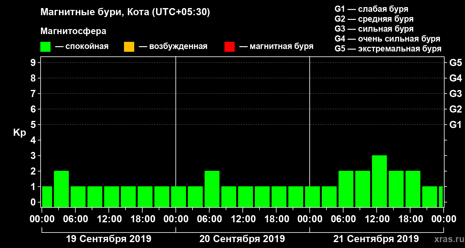 Изменения геомагнитного индекса Kp с 19 по 21 сентября 2019 года для средних широт