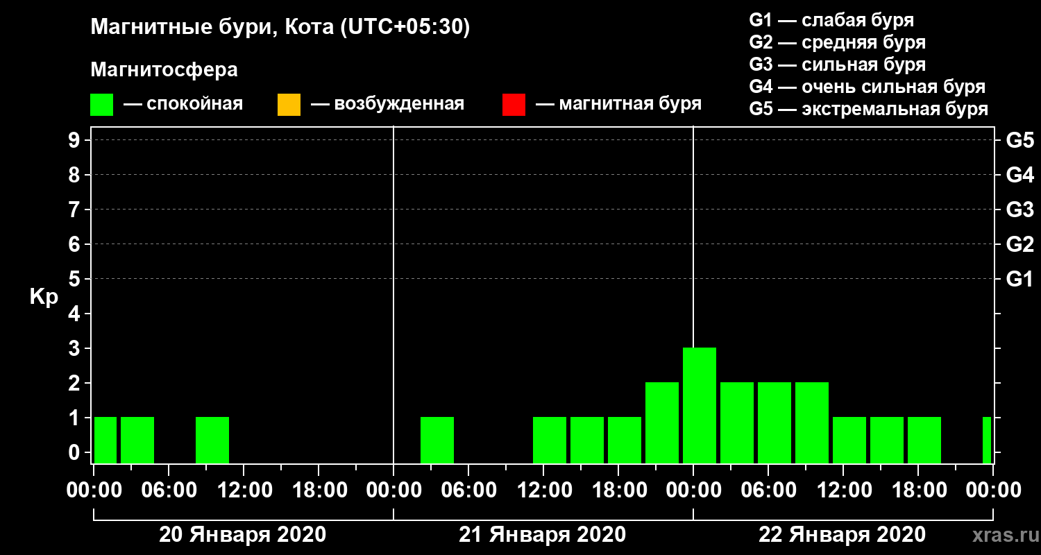 Изменения геомагнитного индекса Kp с 20 по 22 января 2020 года для средних широт