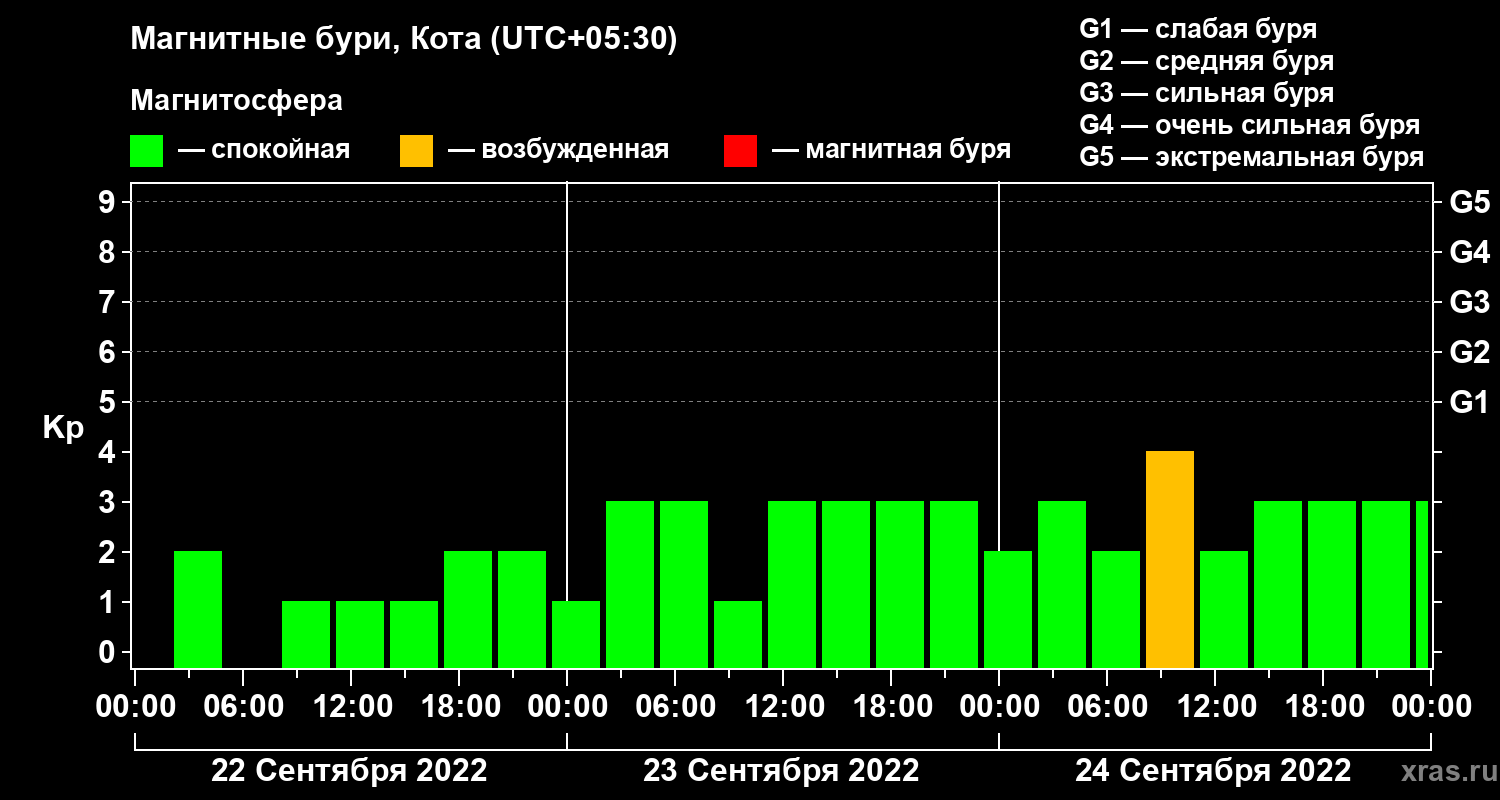 Изменения геомагнитного индекса Kp с 22 по 24 сентября 2022 года для средних широт
