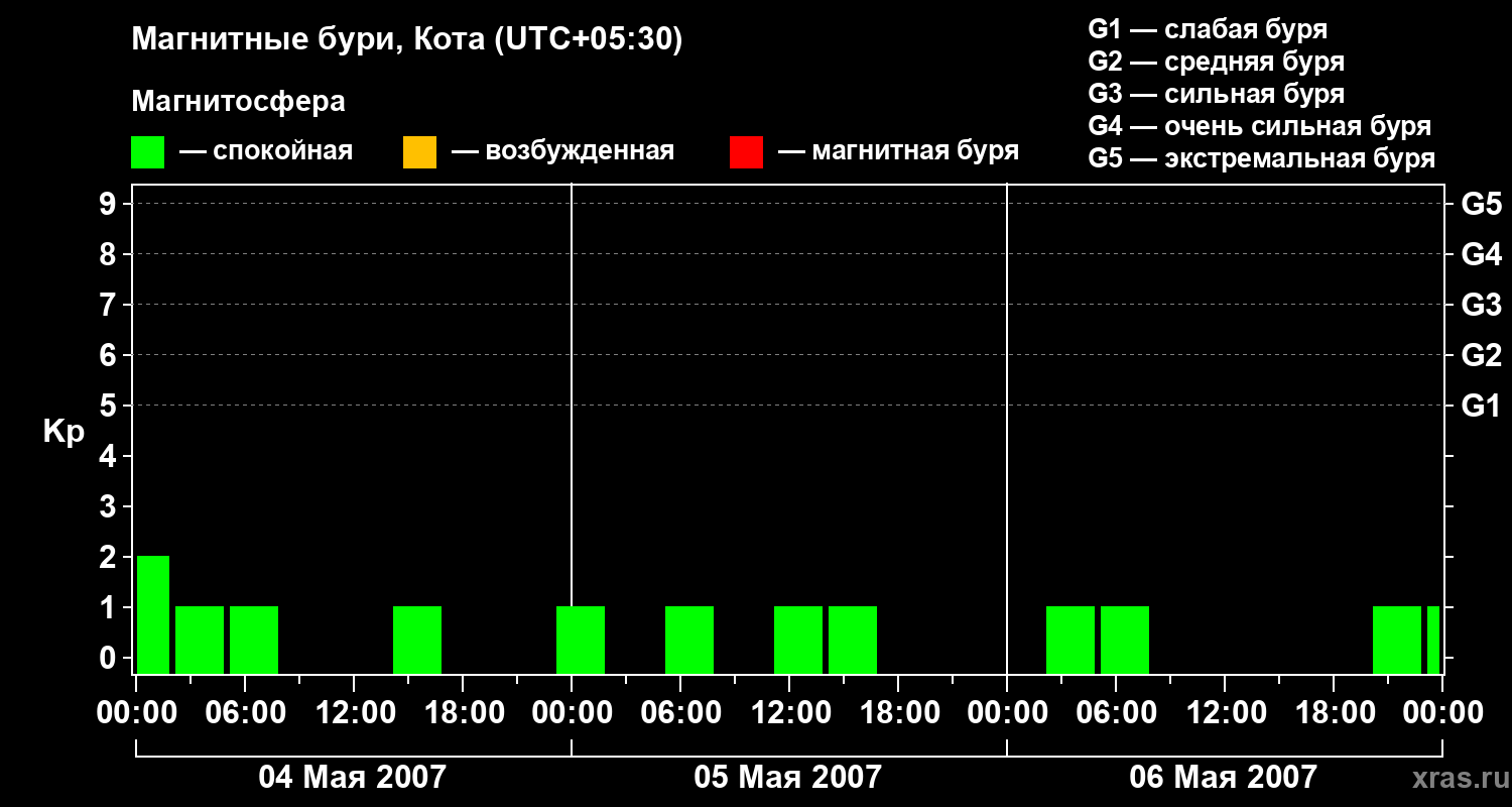 Изменения геомагнитного индекса Kp с 4 по 6 мая 2007 года для средних широт