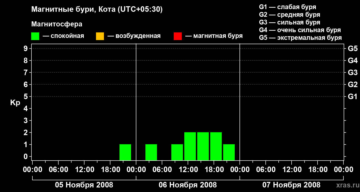 Изменения геомагнитного индекса Kp с 5 по 7 ноября 2008 года для средних широт
