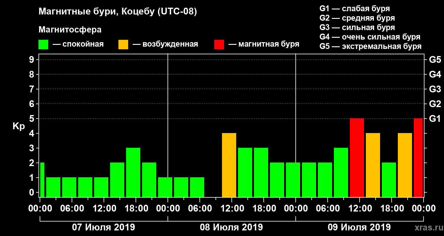 Изменения геомагнитного индекса Kp с 7 по 9 июля 2019 года для средних широт