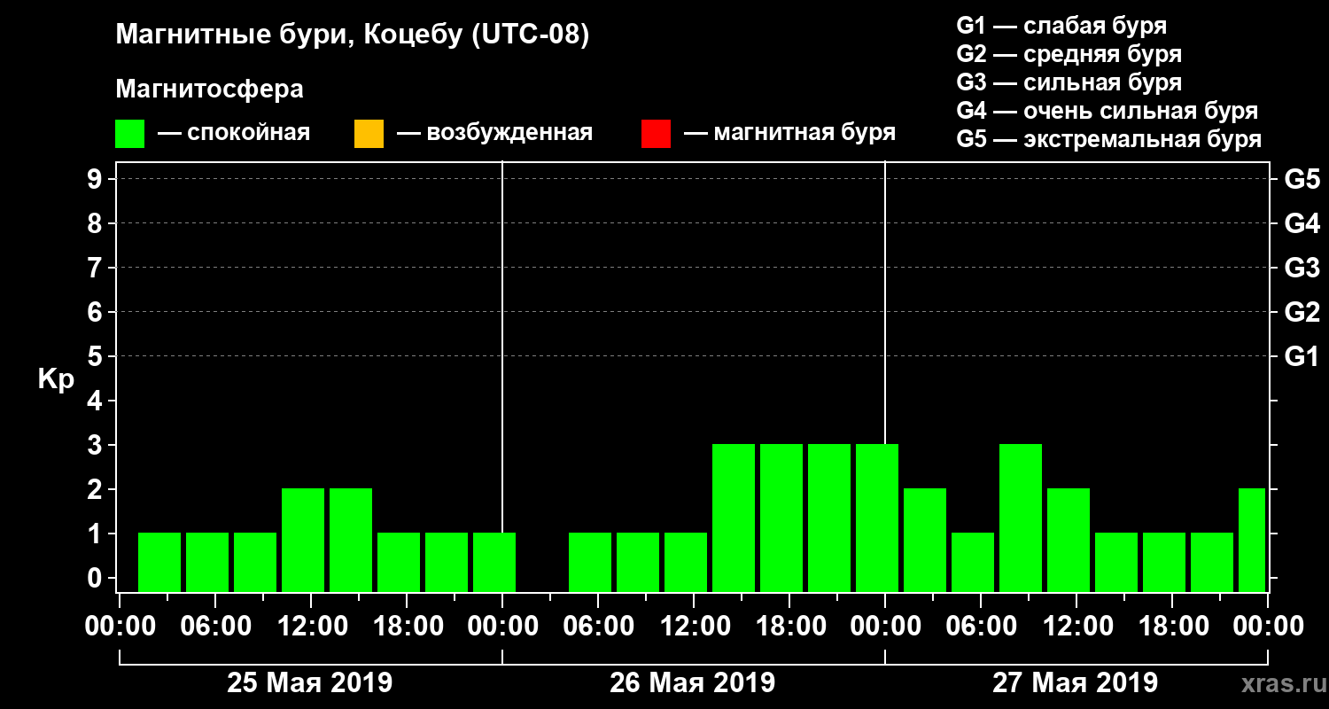 Изменения геомагнитного индекса Kp с 25 по 27 мая 2019 года для средних широт