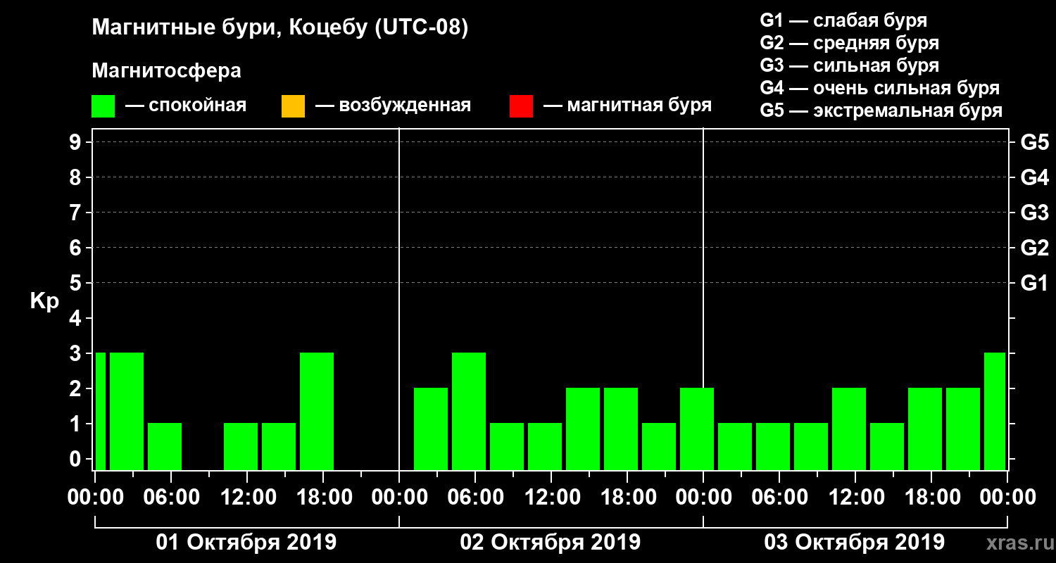 Изменения геомагнитного индекса Kp с 1 по 3 октября 2019 года для средних широт