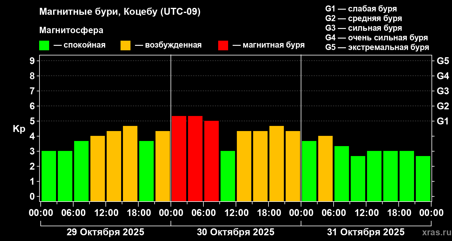 Изменения геомагнитного индекса Kp с 29 по 31 октября 2025 года для средних широт