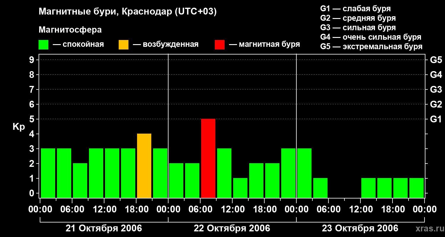 Изменения геомагнитного индекса Kp с 21 по 23 октября 2006 года для средних широт