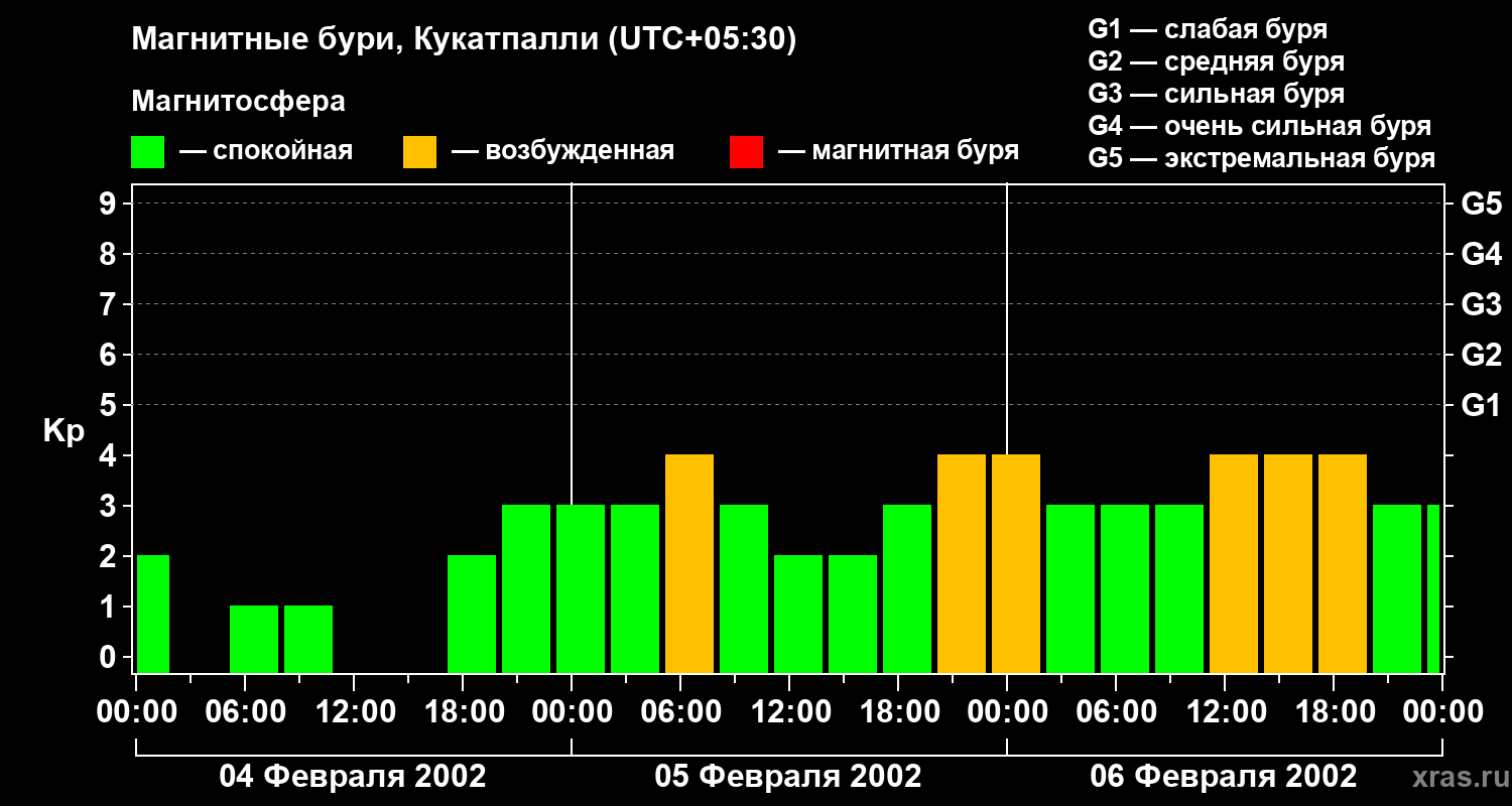 Изменения геомагнитного индекса Kp с 4 по 6 февраля 2002 года для средних широт