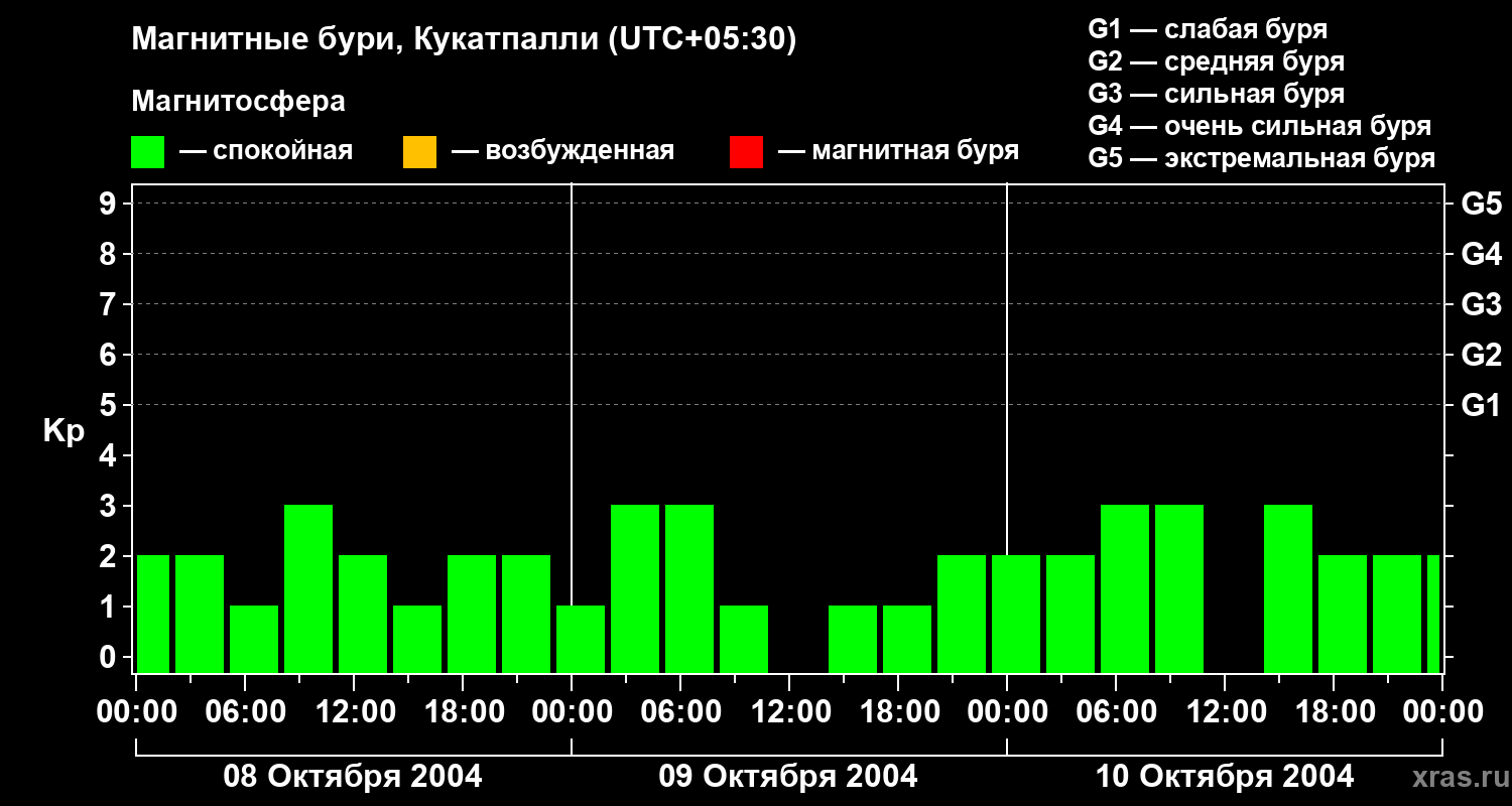 Изменения геомагнитного индекса Kp с 8 по 10 октября 2004 года для средних широт