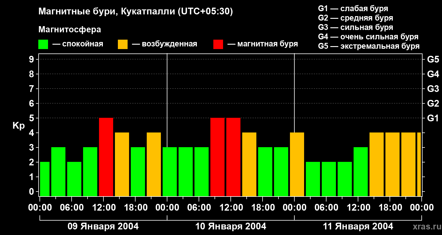 Изменения геомагнитного индекса Kp с 9 по 11 января 2004 года для средних широт
