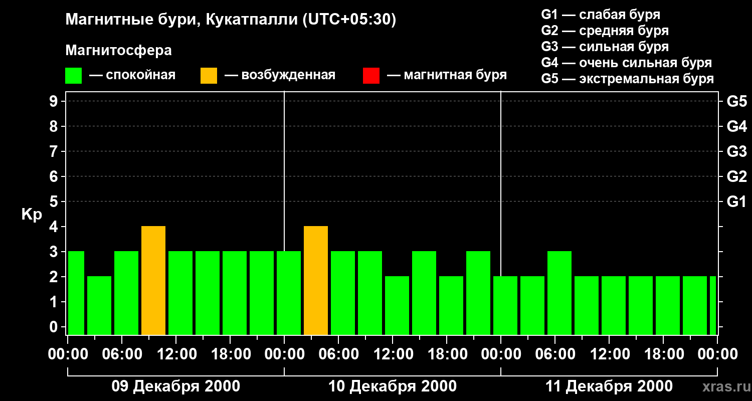 Изменения геомагнитного индекса Kp с 9 по 11 декабря 2000 года для средних широт