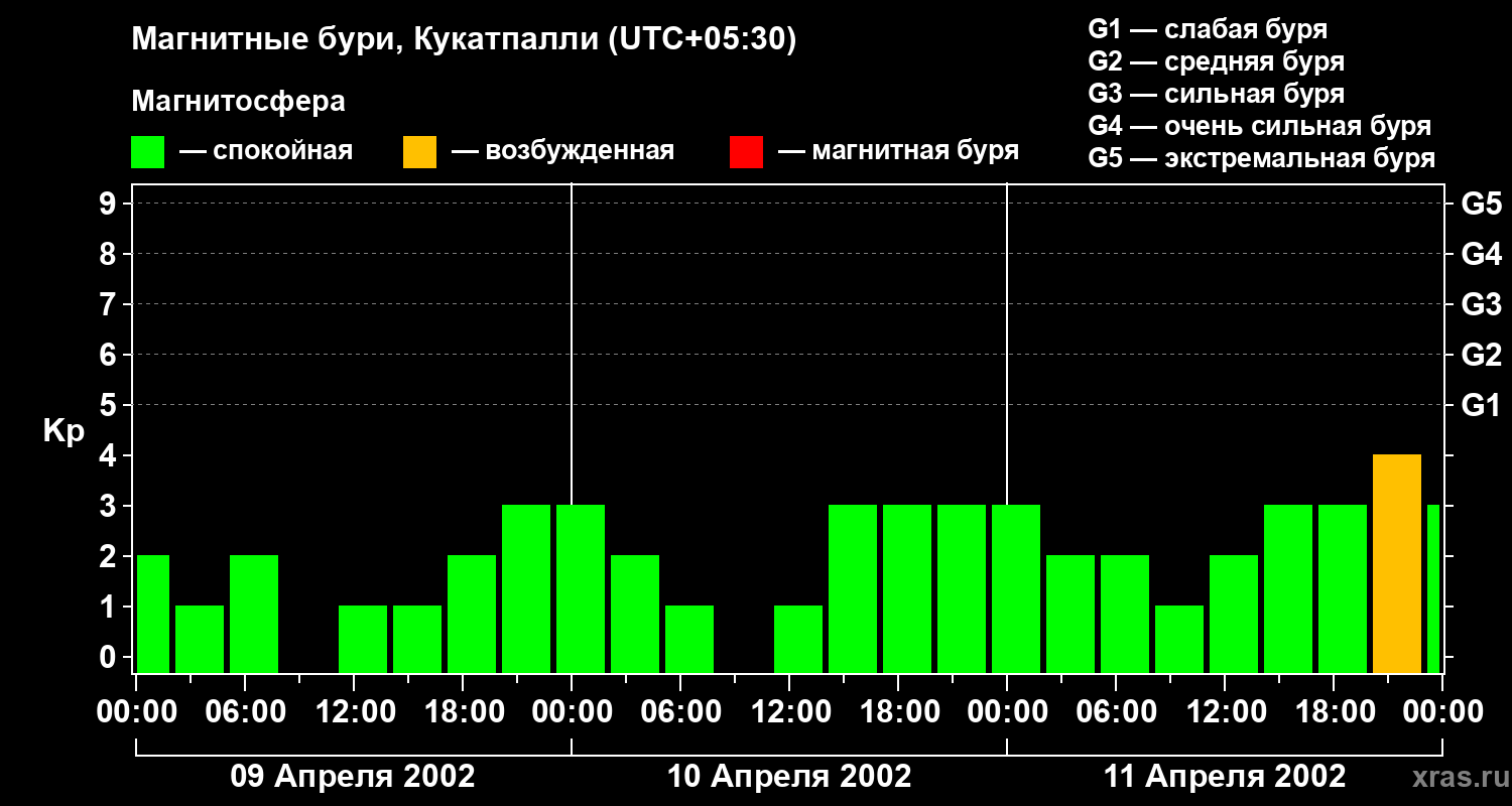 Изменения геомагнитного индекса Kp с 9 по 11 апреля 2002 года для средних широт