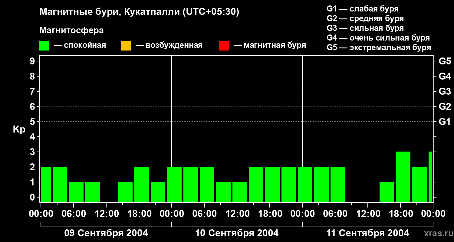 Изменения геомагнитного индекса Kp с 9 по 11 сентября 2004 года для средних широт