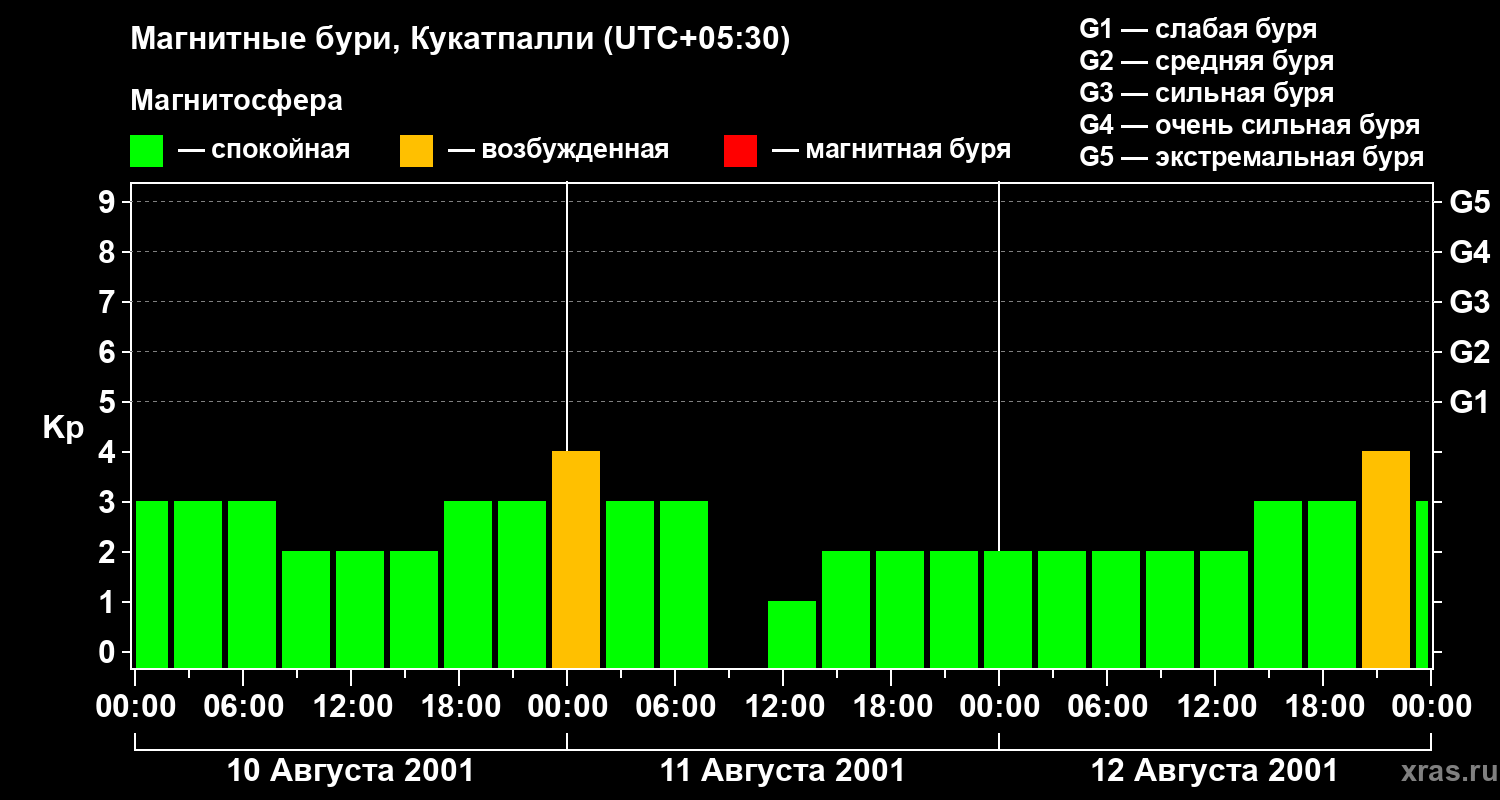Изменения геомагнитного индекса Kp с 10 по 12 августа 2001 года для средних широт