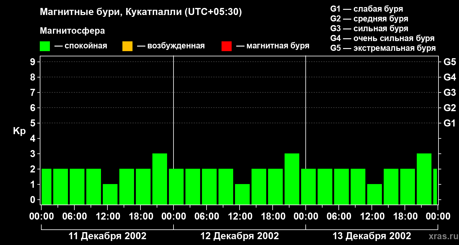 Изменения геомагнитного индекса Kp с 11 по 13 декабря 2002 года для средних широт