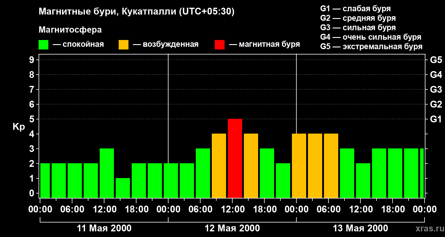 Изменения геомагнитного индекса Kp с 11 по 13 мая 2000 года для средних широт