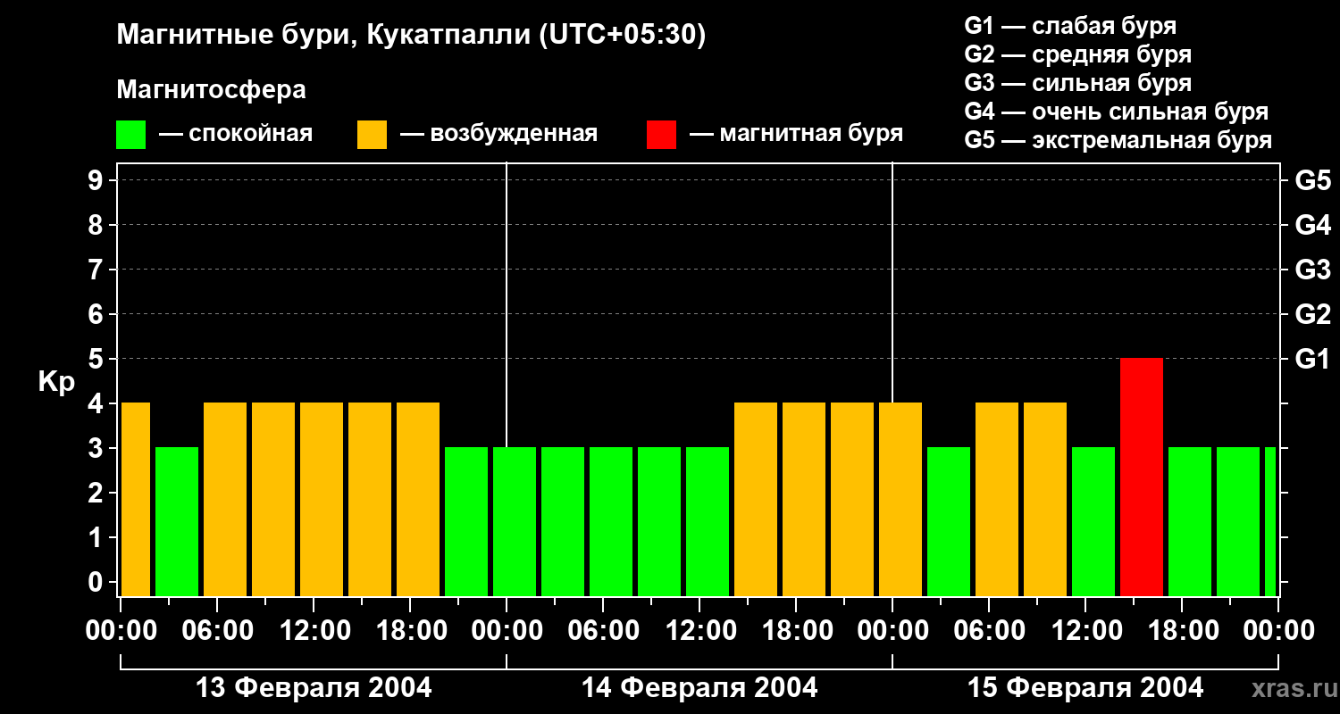 Изменения геомагнитного индекса Kp с 13 по 15 февраля 2004 года для средних широт