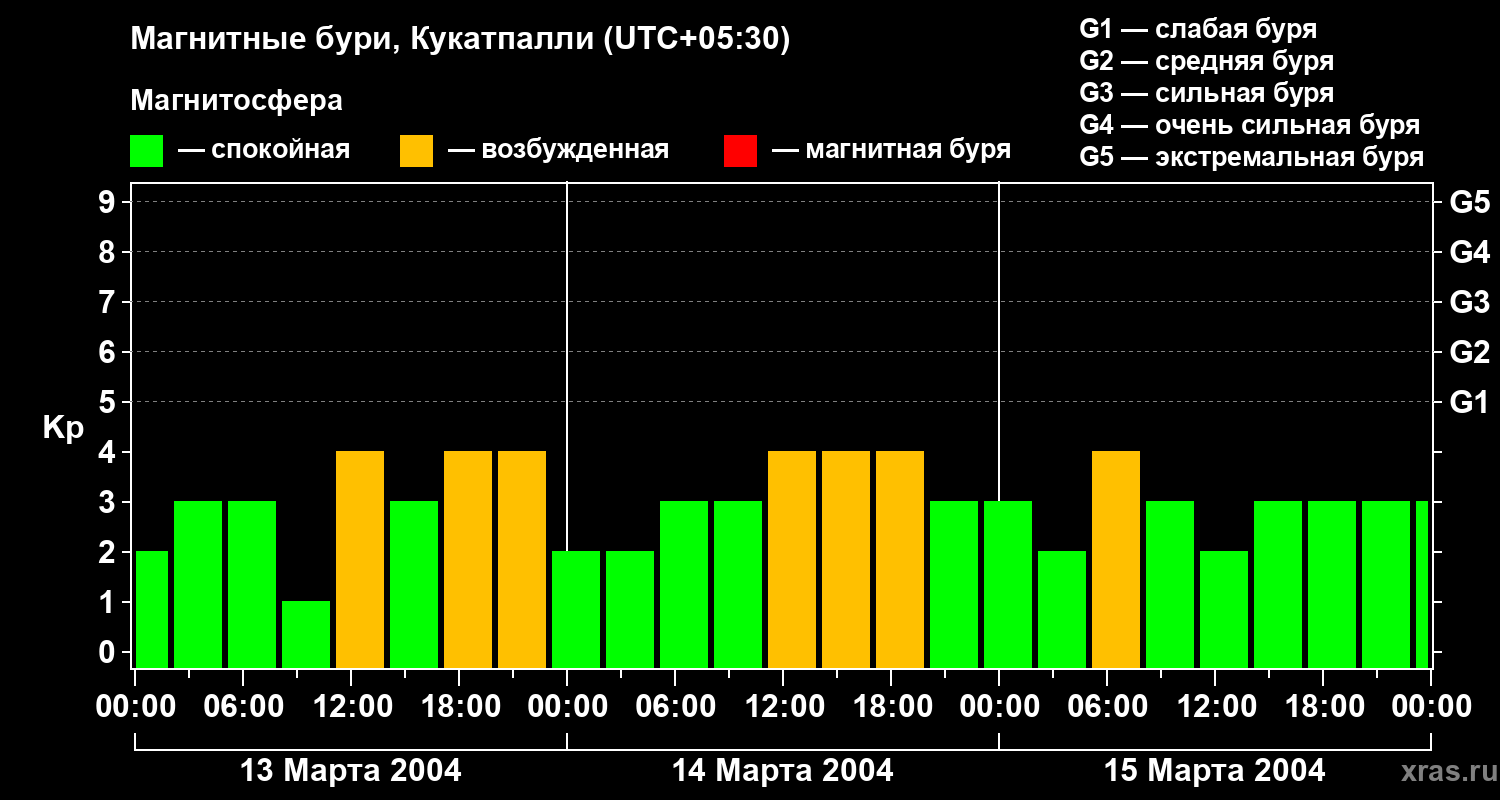 Изменения геомагнитного индекса Kp с 13 по 15 марта 2004 года для средних широт
