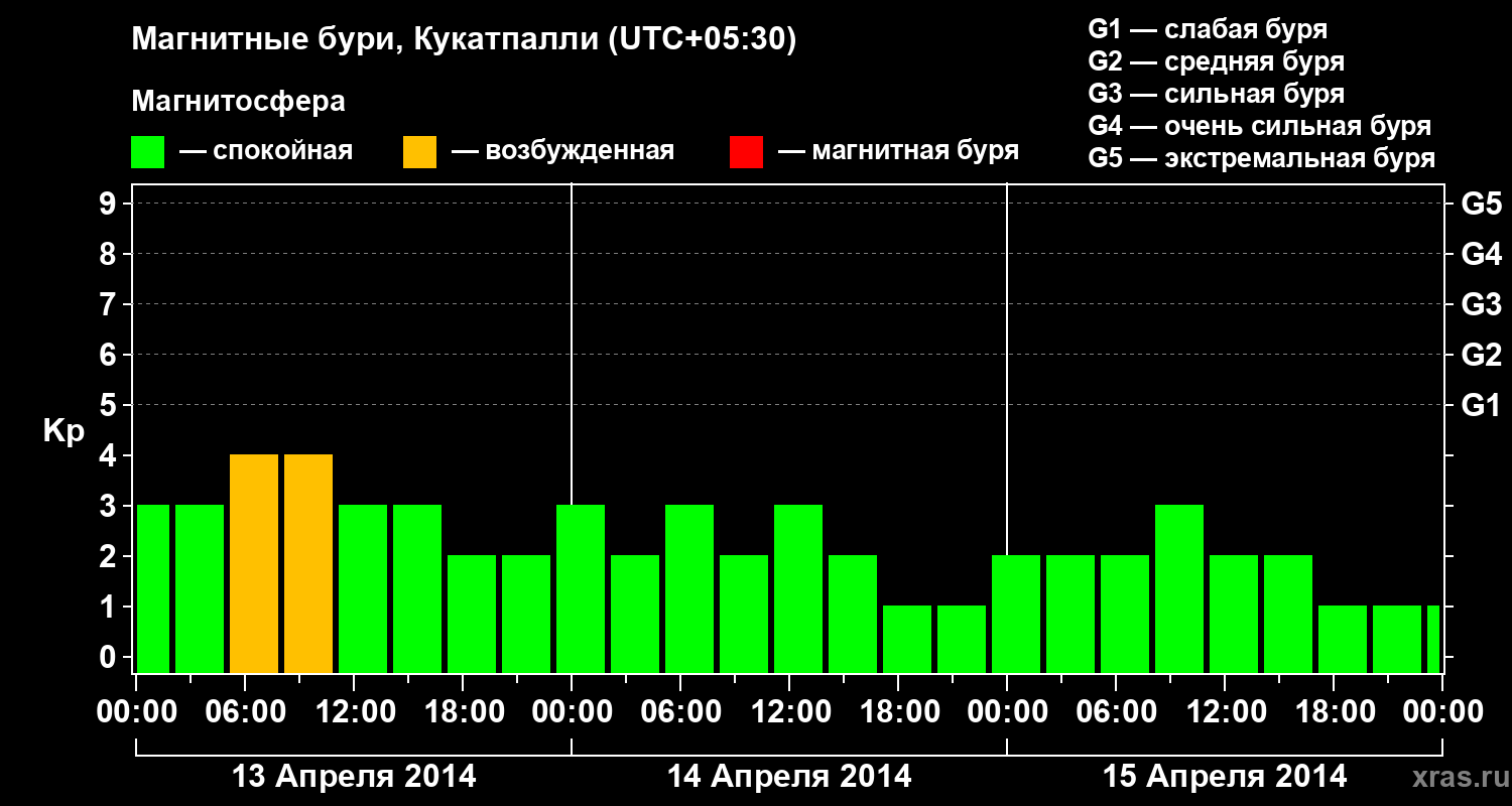 Изменения геомагнитного индекса Kp с 13 по 15 апреля 2014 года для средних широт