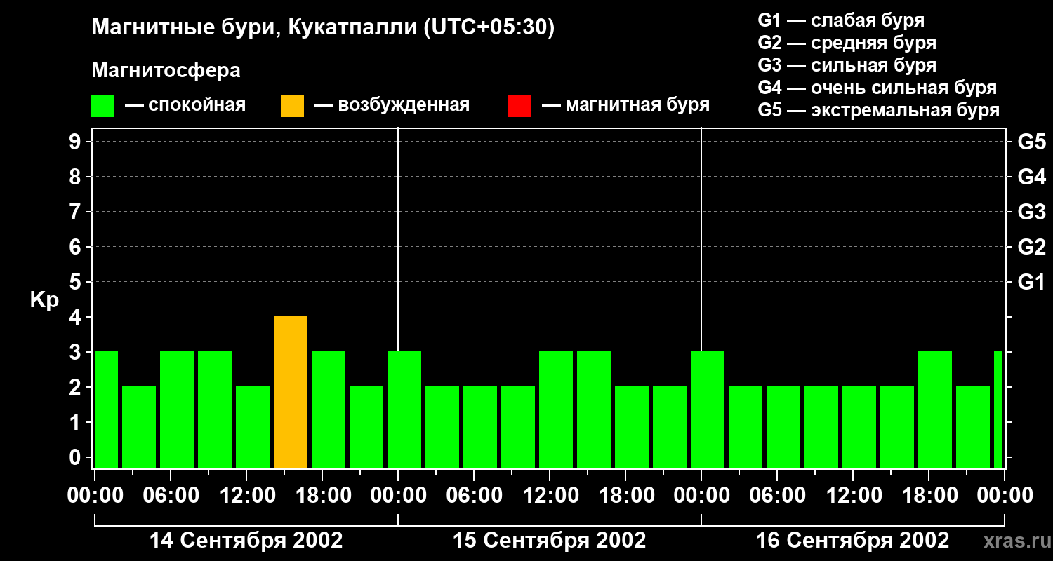 Изменения геомагнитного индекса Kp с 14 по 16 сентября 2002 года для средних широт