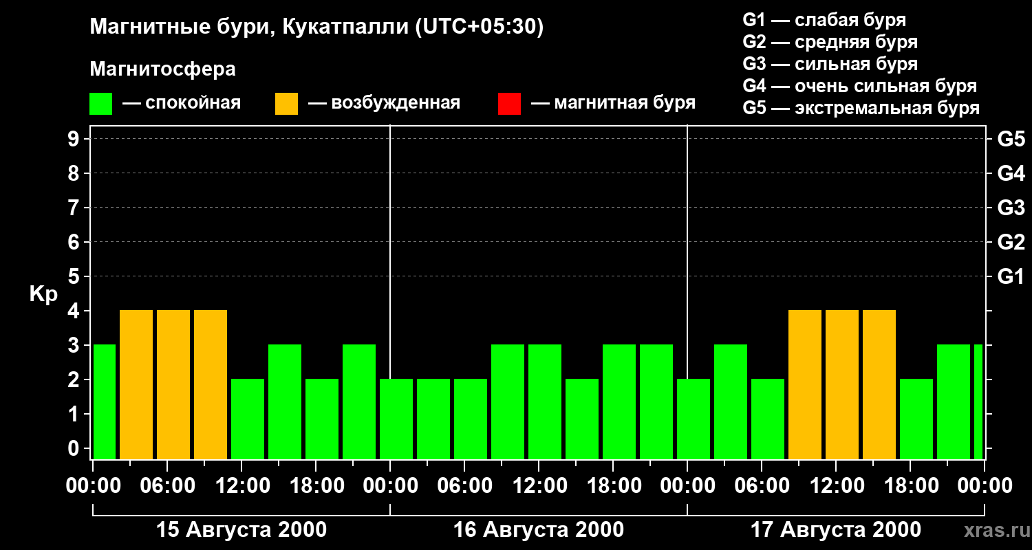Изменения геомагнитного индекса Kp с 15 по 17 августа 2000 года для средних широт