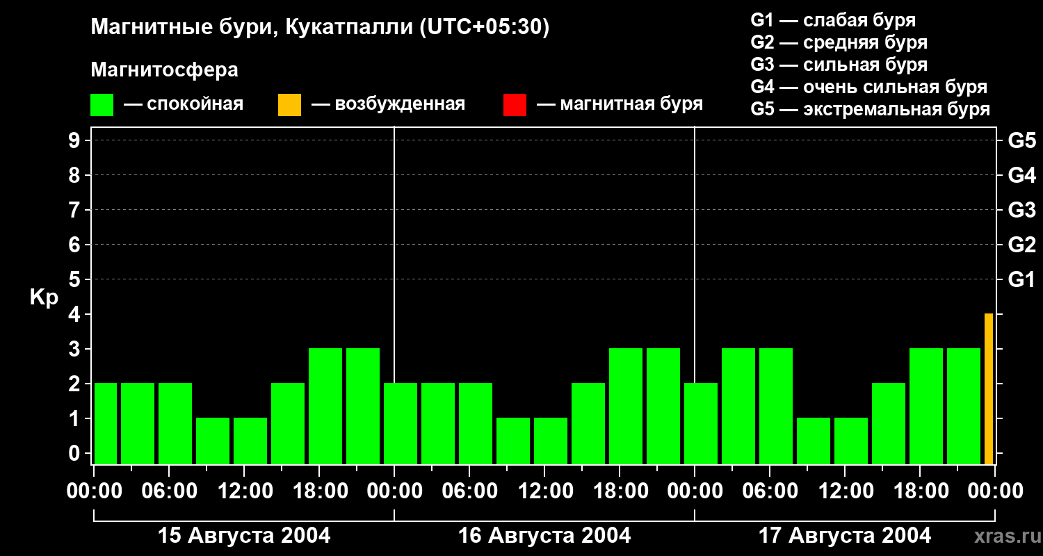 Изменения геомагнитного индекса Kp с 15 по 17 августа 2004 года для средних широт