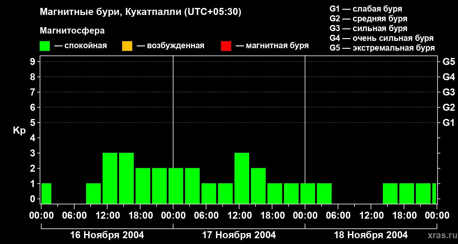 Изменения геомагнитного индекса Kp с 16 по 18 ноября 2004 года для средних широт