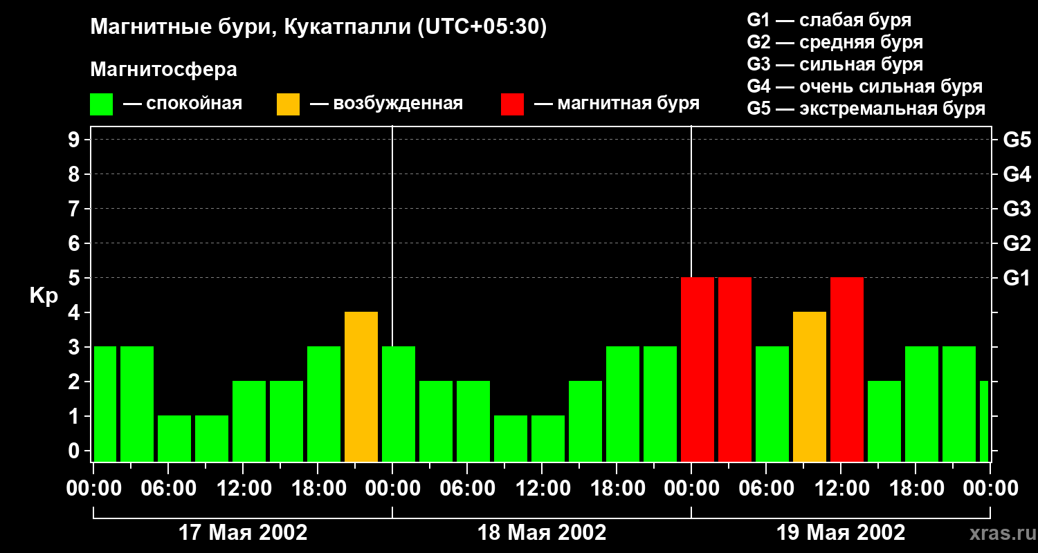 Изменения геомагнитного индекса Kp с 17 по 19 мая 2002 года для средних широт