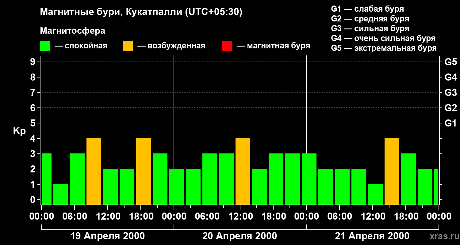 Изменения геомагнитного индекса Kp с 19 по 21 апреля 2000 года для средних широт