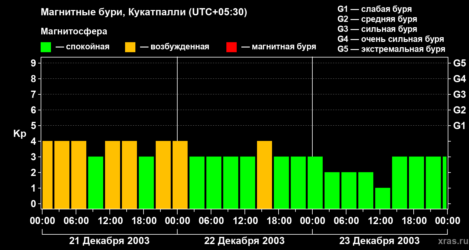 Изменения геомагнитного индекса Kp с 21 по 23 декабря 2003 года для средних широт