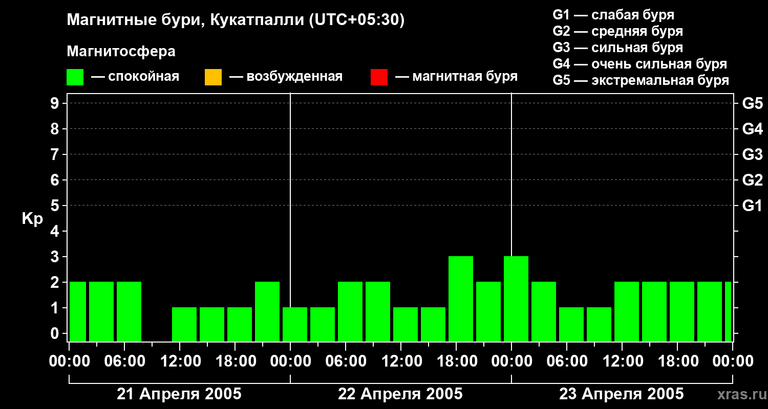 Изменения геомагнитного индекса Kp с 21 по 23 апреля 2005 года для средних широт