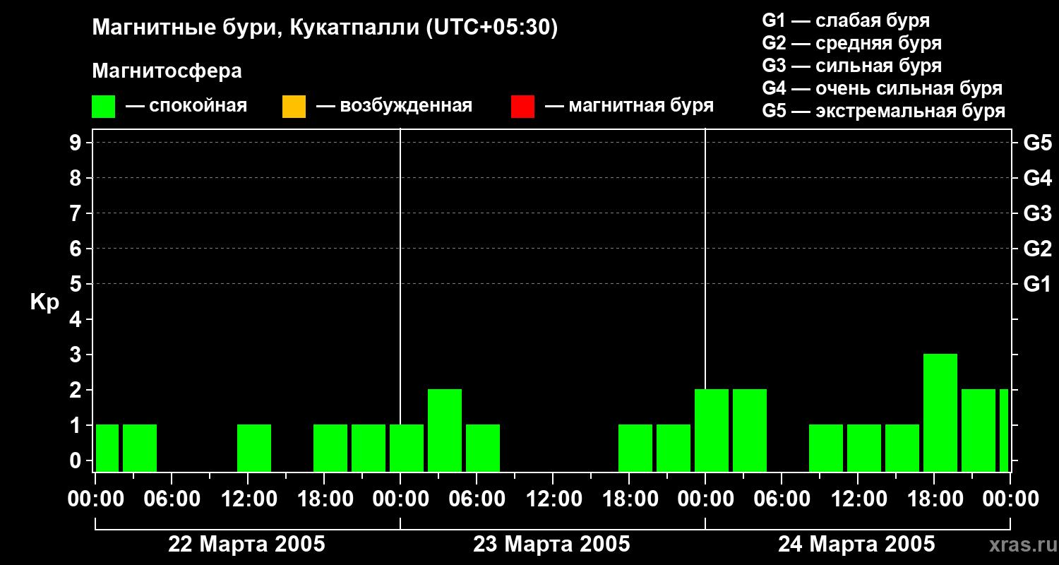 Изменения геомагнитного индекса Kp с 22 по 24 марта 2005 года для средних широт