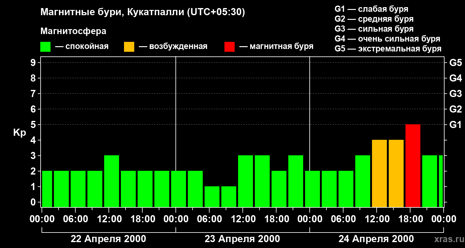 Изменения геомагнитного индекса Kp с 22 по 24 апреля 2000 года для средних широт