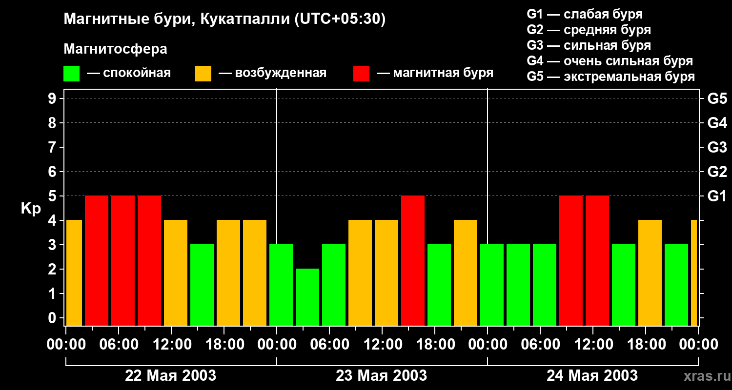 Изменения геомагнитного индекса Kp с 22 по 24 мая 2003 года для средних широт