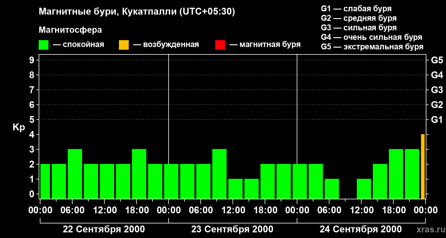 Изменения геомагнитного индекса Kp с 22 по 24 сентября 2000 года для средних широт